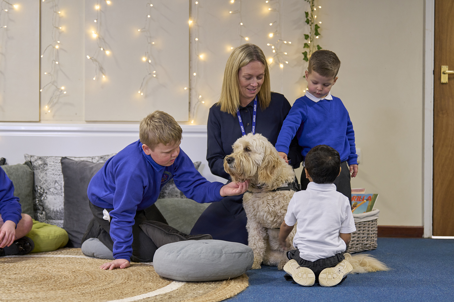 Benji, our school dog, attends Headlands for two days a week. He is a Golden Doodle, a breed of dog that is known for its mild, sociable temperament and hypo-allergenic coat.